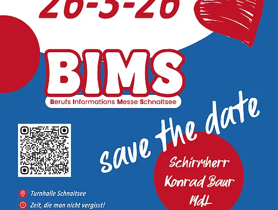 Die Vorbereitungen für unsere hausinterne Berufsinformationsmesse (BIMS) am 26. März 2026 laufen bereits auf Hochtouren – und in diesem Jahr dürfen wir eine ganz besondere Neuerung bekanntgeben: Konrad Bauer, MdL, übernimmt dieses Jahr die Schirmherrschaft unserer Veranstaltung! Wir freuen uns sehr über diese wertvolle Unterstützung, die die Bedeutung der BIMS für unsere Region und für die berufliche Zukunft unserer Schülerinnen und Schüler unterstreicht.